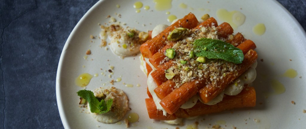 1) To make the roasted carrots, preheat the oven to 180°C. Wash the carrots but keep the skins on. Rub the oil and salt onto the carrots and then place them onto a baking tray. Put the tray into the oven on a medium rack and roast for about 1 hour 20 minutes or until soft.